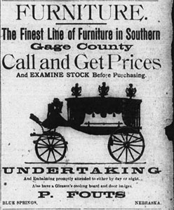 In the fall of 1897, Davis Fouts, a Blue Springs furniture dealer and undertaker, purchased an "elegant new snow-white hearse" which was used for funerals.