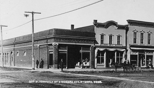 Saturday December 21, 1889In 1894, Horace finished his Greenwood building block on the corner of Niagara (7th) and Bloomfield (E) Street. The First National Bank moved there in January 1895 and from 1896 to 1900 he served as president of the bank. The US Post Office operated from one of the ground floor offices facing E Street. For a time, the first library in Wymore was located upstairs over the bank with Mrs. L.L. Vance as librarian. Local businesses and professionals including Adam McMullen moved in and out of the large building. Greenwood Hall opened in the upstairs and went on to serve the community with dinners, celebrations and as a dance hall well into the 1970s. The new Wymore Community Center opened in the spring of 1975 a block west.